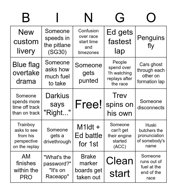 This bingo card has a free space and 35 words: A recent league joiner scores points, Trainboy shows his replay, 3 or more cars die in the first corner, Someone asks how much fuel to take, M1ldt + Ed battle for 1st, Ed gets fastest lap, Blue flag overtake drama, Huski makes a Hoov rhyme, Someone gets punted, Cookie tries to bump draft someone, Someone spends more time off track than on track, Penguins fly, Sensh hates the track, Someone locks up in the skip (free space), New custom livery, Trev spins on his own, Clean start, Darkius says "Right...", Trainboy asks to see from his perspective on the replay, Someone runs out of fuel at the end of the race, Someone can't get their engine started (ACC), AM finishes within the PRO, Huski butchers the pronunciation of somebody's name, "What's the password?" "It's on Raceapp", Confusion over race start time and timezones, Cars ghost through each other on formation lap, *BONUS* (?)Someone crashes on formation lap, Automated Luxury tries to talk while on mute, People spend over 1h watching replays after the race, Someone disconnects, Someone has wheel/pedal issues, Brake marker boards get taken out, Someone gets a drivethrough, Someone speeds in the pitlane (SG30) and Public lobbies after the race.