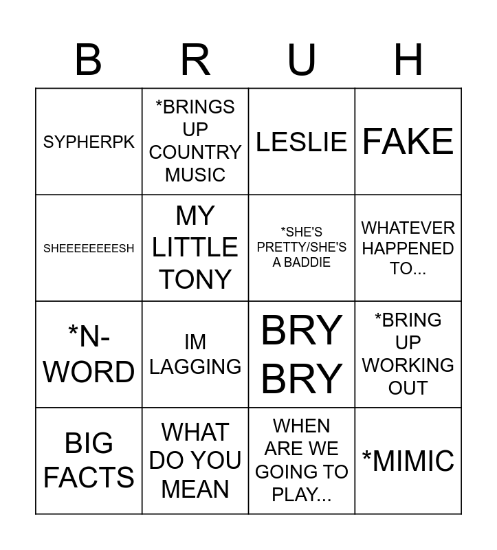 This bingo card has 16 words: BIG FACTS, WHAT DO YOU MEAN, LESLIE, FAKE, SHEEEEEEEESH, *BRINGS UP COUNTRY MUSIC, BRY BRY, *BRING UP WORKING OUT, SYPHERPK, MY LITTLE TONY, WHEN ARE WE GOING TO PLAY..., WHATEVER HAPPENED TO..., *N-WORD, IM LAGGING, *SHE'S PRETTY/SHE'S A BADDIE and *MIMIC.