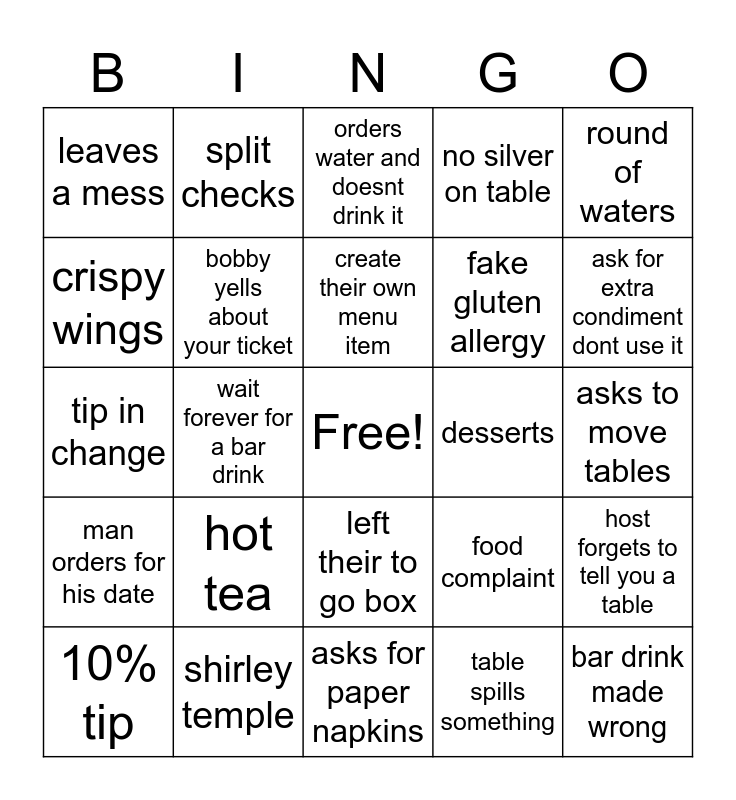This bingo card has a free space and 24 words: hot tea, shirley temple, create their own menu item, 10% tip, round of waters, leaves a mess, crispy wings, split checks, desserts, left their to go box, fake gluten allergy, tip in change, food complaint, host forgets to tell you a table, bobby yells about your ticket, table spills something, asks to move tables, orders water and doesnt drink it, ask for extra condiment dont use it, wait forever for a bar drink, bar drink made wrong, man orders for his date, no silver on table and asks for paper napkins.