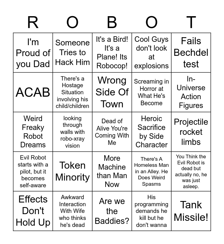 This bingo card has a free space and 24 words: Token Minority, Awkward Interaction With Wife who thinks he's dead, Wrong Side Of Town, Effects Don't Hold Up, Fails Bechdel test, I'm Proud of you Dad, ACAB, Someone Tries to Hack Him, Heroic Sacrifice by Side Character, More Machine than Man Now, Screaming in Horror at What He's Become, Weird Freaky Robot Dreams, There's A Homeless Man in an Alley. He Does Weird Spasms, You Think the Evil Robot is dead but actually no, he was just asleep., There's a Hostage Situation involving his child/children, His programming demands he kill but he don't wanna, Projectile rocket limbs, It's a Bird! It's a Plane! Its Robocop!, In-Universe Action Figures, looking through walls with robo-xray vision, Tank Missile!, Evil Robot starts with a pilot, but it becomes self-aware, Cool Guys don't look at explosions and Are we the Baddies?.
