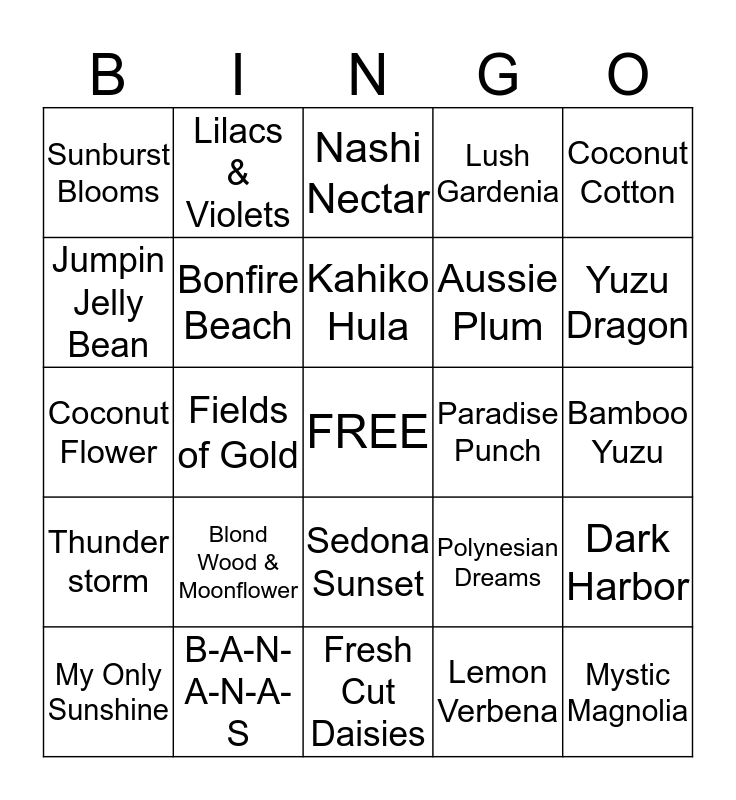 This bingo card has a free space and 24 words: Blond Wood & Moonflower, B-A-N-A-N-A-S, Kahiko Hula, My Only Sunshine, Coconut Cotton, Sunburst Blooms, Jumpin Jelly Bean, Lilacs & Violets, Paradise Punch, Sedona Sunset, Aussie Plum, Coconut Flower, Polynesian Dreams, Dark Harbor, Bonfire Beach, Lemon Verbena, Bamboo Yuzu, Nashi Nectar, Yuzu Dragon, Fields of Gold, Mystic Magnolia, Thunder storm, Lush Gardenia and Fresh Cut Daisies.