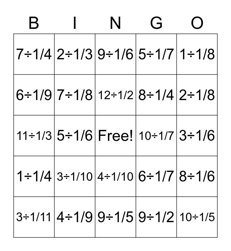 This bingo card has a free space and 24 words: 3÷1/10, 4÷1/9, 12÷1/2, 3÷1/11, 1÷1/8, 7÷1/4, 6÷1/9, 2÷1/3, 10÷1/7, 4÷1/10, 8÷1/4, 11÷1/3, 6÷1/7, 8÷1/6, 7÷1/8, 9÷1/2, 3÷1/6, 9÷1/6, 2÷1/8, 5÷1/6, 10÷1/5, 1÷1/4, 5÷1/7 and 9÷1/5.