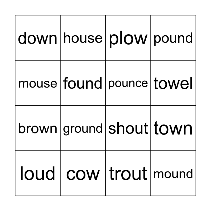 This bingo card has 16 words: cow, town, plow, down, brown, house, shout, trout, mouse, found, loud, pound, ground, towel, pounce and mound.