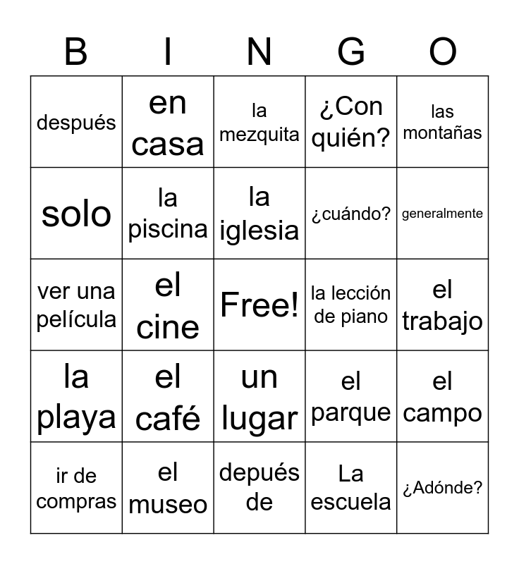 This bingo card has a free space and 32 words: La escuela, la biblioteca, el cine, el teatro, la playa, la piscina, las montañas, el campo, en casa, el centro comercial, la iglesia, la mezquita, el templo, la sinagoga, la lección de piano, tiempo libre, ir de compras, ver una película, un lugar, el café, el parque, el restaurante, el trabajo, el museo, ¿Adónde?, ¿Con quién?, ¿cuándo?, solo, después, depués de, los fines de semana and generalmente.