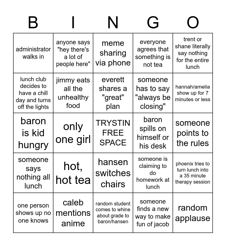 This bingo card has a free space and 39 words: it's not--but it is, stuff not thrown away, jimmy shows up with tons of unhealthy food, jimmy eats all the unhealthy food, one person shows up no one knows, hansen switches chairs, everett shares a "great" plan, someone announces they are leaving PRLHS, trent or shane literally say nothing for the entire lunch, someone says nothing all lunch, only one girl, everyone agrees that something is not tea, random applause, someone points to the rules, baron spills on himself or his desk, hot, hot tea, someone brings food to share, administrator walks in, story that makes no sense/everyone hates, someone is claiming to do homework at lunch, lunch club decides to have a chill day and turns off the lights, random student comes to whine about grade to baron/hansen, someone has to say "always be closing", hannah/amelia show up for 7 minutes or less, race/ethnicity/religion are mentioned in a way that needs correcting and explaining, "it's priest river", someone mentions that they're getting a job, big plans are made with zero execution, anyone comments on depressing school lunch, anyone says "hey there's a lot of people here", hansen "advice", "you have to watch/listen to this" no one does, meme sharing via phone, caleb mentions anime, someone finds a new way to make fun of jacob, jacob says "look at me" or "even I...", phoenix tries to turn lunch into a 35 minute therapy session, baron is kid hungry and chalkboard writing or drawing that basically is graffiti.