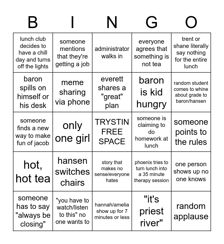This bingo card has a free space and 37 words: it's not--but it is, stuff not thrown away, jimmy shows up with tons of unhealthy food and eats all of it, meme sharing via phone, one person shows up no one knows, hansen switches chairs, everett shares a "great" plan, someone announces they are leaving PRLHS, trent or shane literally say nothing for the entire lunch, caleb mentions anime, only one girl, everyone agrees that something is not tea, random applause, someone points to the rules, baron spills on himself or his desk, hot, hot tea, someone brings food to share, administrator walks in, story that makes no sense/everyone hates, someone is claiming to do homework at lunch, lunch club decides to have a chill day and turns off the lights, random student comes to whine about grade to baron/hansen, someone has to say "always be closing", hannah/amelia show up for 7 minutes or less, race/ethnicity/religion are mentioned in a way that needs correcting and explaining, "it's priest river", someone mentions that they're getting a job, big plans are made with zero execution, anyone comments on depressing school lunch, anyone says "hey there's a lot of people here", hansen "advice", "you have to watch/listen to this" no one wants to, someone finds a new way to make fun of jacob, jacob says "look at me" or "even I...", phoenix tries to turn lunch into a 35 minute therapy session, baron is kid hungry and chalkboard writing or drawing that basically is graffiti.