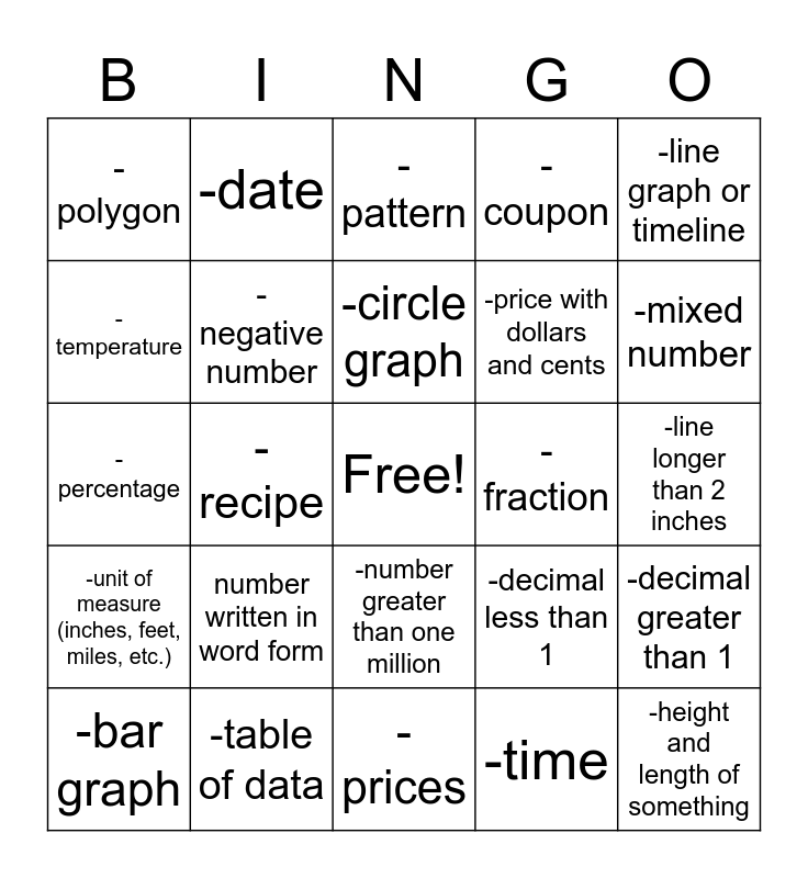 This bingo card has a free space and 24 words: number written in word form, -table of data, -circle graph, -bar graph, -line graph or timeline, -polygon, -temperature, -date, -fraction, -number greater than one million, -price with dollars and cents, -percentage, -decimal less than 1, -decimal greater than 1, -negative number, -time, -line longer than 2 inches, -pattern, -mixed number, -recipe, -height and length of something, -unit of measure (inches, feet, miles, etc.), -coupon and -prices.