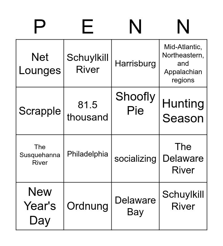 This bingo card has 20 words: The Delaware River, Lake Pymatuning, Harrisburg, Mud Sales, New Year's Day, Scrapple, Ordnung, Net Lounges, The Susquehanna River, Schuylkill River, Philadelphia, socializing, 81.5 thousand, Schuylkill River, Shoofly Pie, Pittsburgh, Hunting Season, Mid-Atlantic, Northeastern, and Appalachian regions, Delaware Bay and Lenape Native Americans.