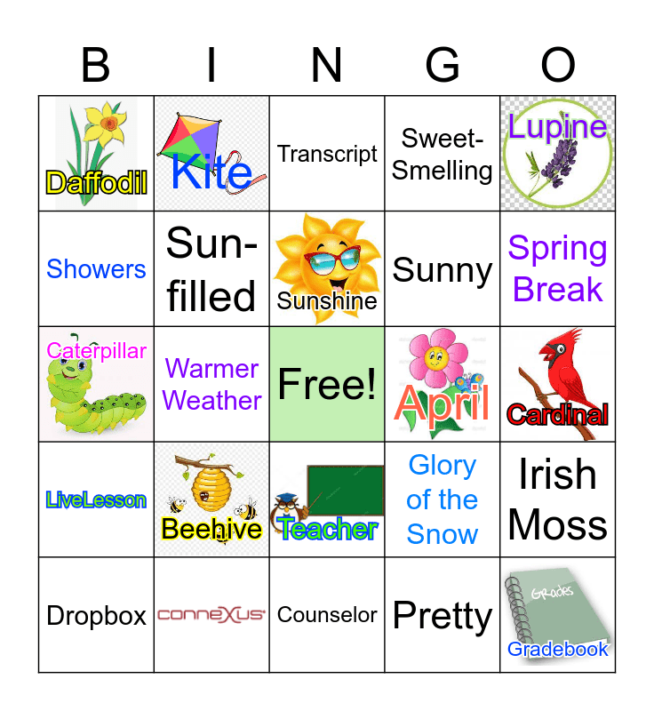 This bingo card has 35 images, a free space and 96 words: OCA, Flowers, Books, April, Baseball, Blossom, Breeze, Bunny, Easter, March, May, Rain, Rainbow, Spring Break, Spring, Showers, Sunshine, Sprout, Melt, Umbrella, Warming, Weather, Windy, Webmail, Teacher, Counselor, Pansy, Daffodil, Primrose, Iris, Lenten Rose, Glory of the Snow, Tulip, Easter Egg Hunt, Lupine, Lily of the Valley, Irish Moss, Snapdragon, Sweet Pea, Warmer Weather, Activity Tracker, Dropbox, Gradebook, Connexus, LiveLesson, Transcript, Planner, Rain Boots, Quickcheck, Portfolio, Progress Plan, Data View, EOC Exam, Dying Eggs, Beautiful, Blissful, Blooming, Bright, Colorful, Delightful, Enjoyable, Flourishing, Fragrant, Fresh, Grassy, Growing, Happy, Light, Lush, Pretty, Rainy, Refreshing, Renewing, Spring Green, Springtime, Sprouting, Sun-drenched, Sun-filled, Sun-kissed, Sunny, Sweet-Smelling, Swimming, Pastel Colors, Outdoors, Butterfly, Caterpillar, Beehive, Bee, Bluebirds, Cardinal, Garden, Gardener, Gardening, Raincoat, Kite and Earth Day.