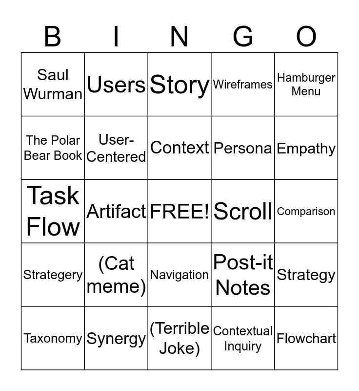 This bingo card has a free space and 24 words: (Cat meme), Synergy, Context, Taxonomy, Hamburger Menu, Saul Wurman, The Polar Bear Book, Users, Scroll, Navigation, Persona, Task Flow, Post-it Notes, Strategy, User-Centered, Contextual Inquiry, Comparison, Story, Empathy, Artifact, Flowchart, Strategery, Wireframes and (Terrible Joke).