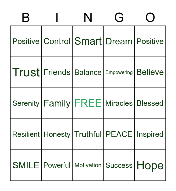 This bingo card has a free space and 29 words: SMILE, Attitude, Family, Help, Positive, Smart, Friends, Honesty, Miracles, Powerful, Blessed, Hope, Motivation, Success, Believe, Strong, Truthful, Resilient, Positive, Serenity, PEACE, Gratitude, Empowering, Trust, Dream, Control, Inspired, Balance and Compassion.