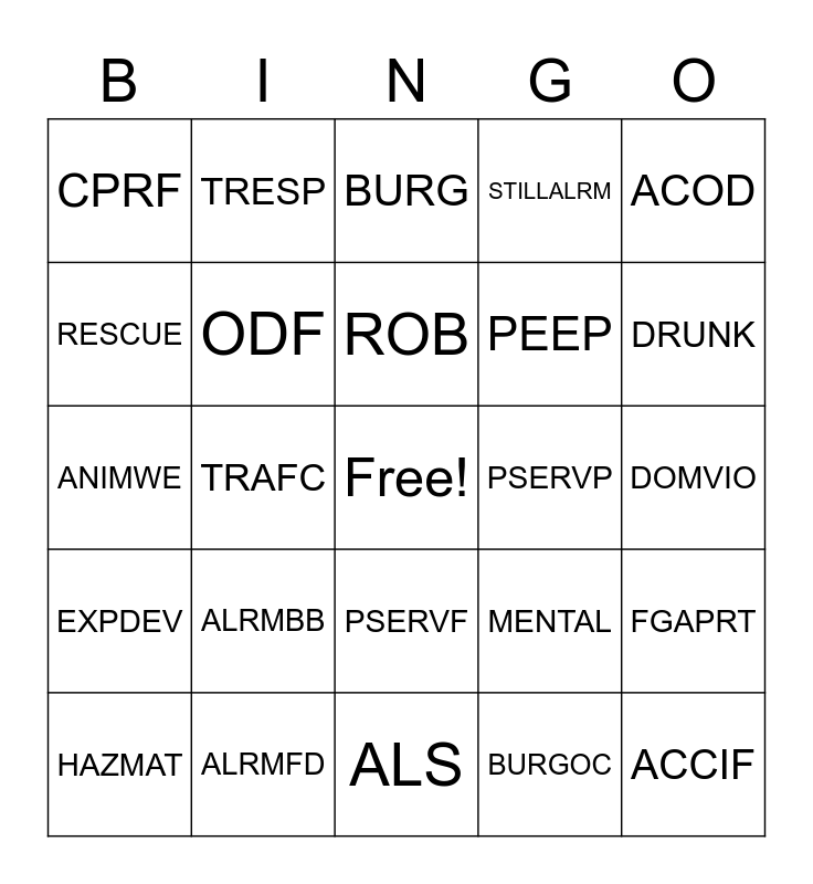 This bingo card has a free space and 45 words: ACC, ACCIF, MEDICAL, HAZMAT, TS, BURGOC, BURG, ACCITP, ACOD, ALRMFD, STILLALRM, PSERVP, PSERVF, ALRMBB, AMED, ALS, ANIMB, ANIMWE, ASLT, DRUNK, TRESP, BURN, CLOSED, CPRF, DEADP, DOMVIO, DOMDIS, DRILL, MENTAL, EXPDEV, FBLDG, FGAPRT, FHIRIS, FOUT, FTH, TRAFC, SYSOUT, SYSIN, SUIT, ROB, RESCUE, PEEP, OPEN, ODF and ODP.