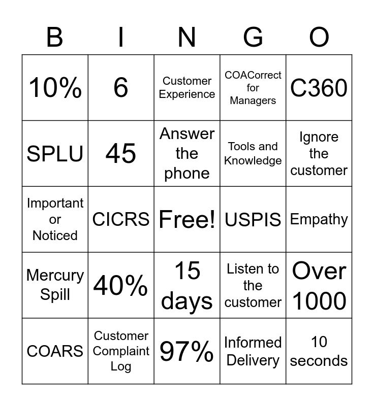 This bingo card has a free space and 24 words: 40%, Customer Complaint Log, Answer the phone, COARS, C360, 10%, SPLU, 6, USPIS, 15 days, Tools and Knowledge, Important or Noticed, Listen to the customer, Over 1000, 45, Informed Delivery, Empathy, Customer Experience, Ignore the customer, CICRS, 10 seconds, Mercury Spill, COACorrect for Managers and 97%.