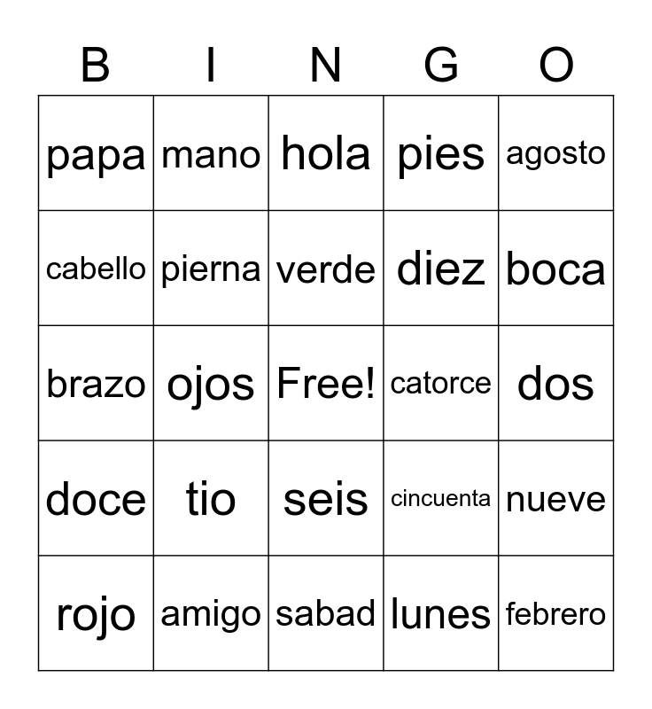 This bingo card has a free space and 74 words: Adios, gracias, hola, buenos dias, buenos noches, buenas tardes, naranja, azul, rojo, amarillo, negro, blanco, verde, cabello, cara, ojos, nariz, boca, sonreir, brazo, pierna, mano, pies, enero, febrero, marzo, abril, mayo, junio, julio, agosto, septirmbre, octubre, noviembre, diciembre, lunes, martes, miercoles, jueves, viernes, sabad, amigo, hermano, hermana, mama, papa, tia, tio, hijo, hija, casa, uno, dos, tres, cuatro, cinco, seis, siete, ocho, nueve, diez, once, doce, trece, catorce, quince, treinta, cuarenta, cincuenta, sesenta, setenta, ochenta, noventa and cien.
