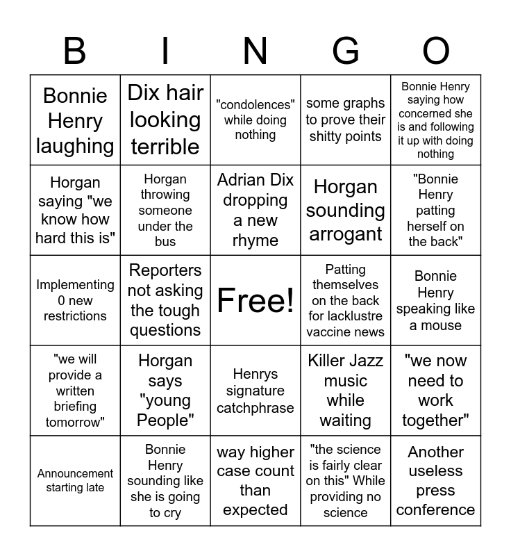 This bingo card has a free space and 24 words: Horgan says "young People", Bonnie Henry sounding like she is going to cry, Adrian Dix dropping a new rhyme, Announcement starting late, Bonnie Henry saying how concerned she is and following it up with doing nothing, Bonnie Henry laughing, Horgan saying "we know how hard this is", Dix hair looking terrible, Patting themselves on the back for lacklustre vaccine news, Henrys signature catchphrase, Horgan sounding arrogant, Implementing 0 new restrictions, Killer Jazz music while waiting, "we now need to work together", Horgan throwing someone under the bus, "the science is fairly clear on this" While providing no science, Bonnie Henry speaking like a mouse, "condolences" while doing nothing, "Bonnie Henry patting herself on the back", Reporters not asking the tough questions, Another useless press conference, "we will provide a written briefing tomorrow", some graphs to prove their shitty points and way higher case count than expected.