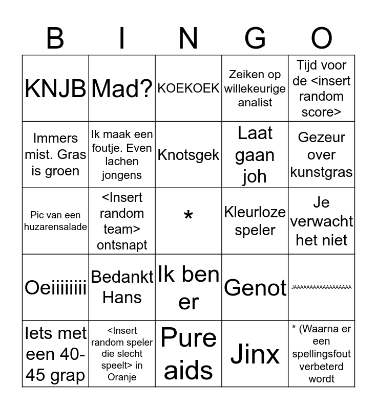 This bingo card has a free space and 24 words: Bedankt Hans, <Insert random speler die slecht speelt> in Oranje, Knotsgek, Iets met een 40-45 grap, Tijd voor de <insert random score>, KNJB, Immers mist. Gras is groen, Mad?, Kleurloze speler, Ik ben er, Laat gaan joh, Pic van een huzarensalade, Genot, JAAAAAAAAAAAAAAAAAA, Ik maak een foutje. Even lachen jongens, Jinx, Je verwacht het niet, KOEKOEK, Gezeur over kunstgras, <Insert random team> ontsnapt, * (Waarna er een spellingsfout verbeterd wordt, Oeiiiiiiii, Zeiken op willekeurige analist and Pure aids.