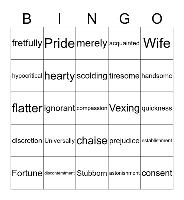 This bingo card has 25 words: Universally, Stubborn, scolding, Fortune, Wife, fretfully, hypocritical, Pride, Vexing, chaise, tiresome, flatter, prejudice, establishment, hearty, consent, quickness, merely, handsome, ignorant, compassion, discontemtment, discretion, acquainted and astonishment.