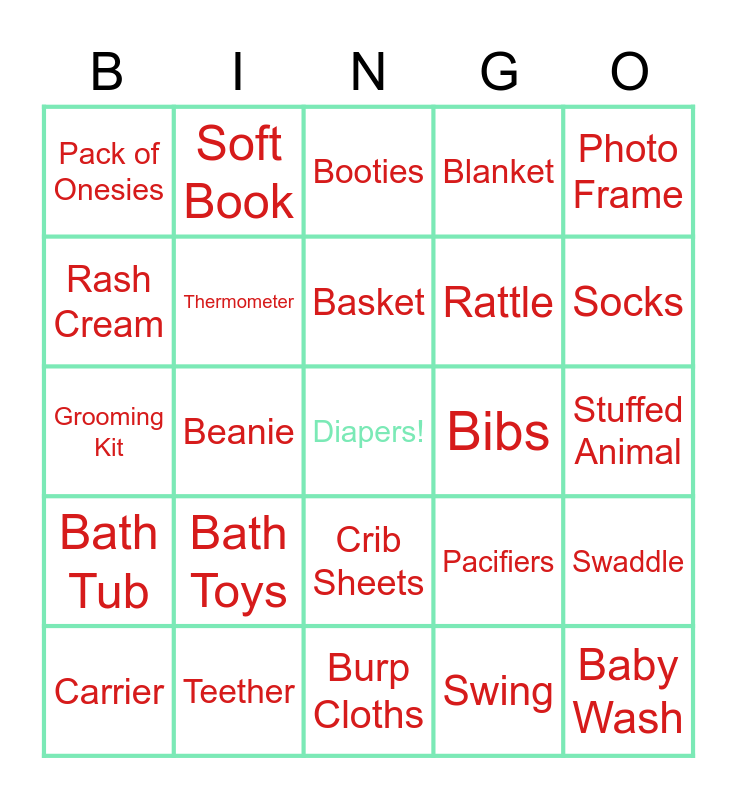 This bingo card has a free space and 32 words: Bottles, Teether, Burp Cloths, Hooded Towel, Socks, Pack of Onesies, Beanie, Crib Sheets, Blanket, Baby Wash, Rash Cream, Soft Book, Swing, Wipes, Bath Tub, Mittens, High Chair, Bibs, Stuffed Animal, Carrier, Bath Toys, Spoons, Pacifiers, Swaddle, Grooming Kit, Thermometer, Booties, Rattle, Photo Frame, Lotion, Jumper and Basket.