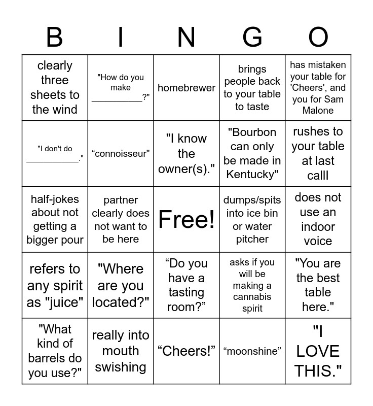 This bingo card has a free space and 60 words: shoots the sample like there's no tomorrow, really into mouth swishing, takes nosing a little too seriously, refers to any spirit as "juice", “moonshine”, “white dawg", “connoisseur", mentions home distilling, "Bourbon can only be made in Kentucky", "Do you have any single malt?", brings people back to your table to taste, Apologizes for requesting a second pour of the sample spirit. No one should have to apologize for enjoying your product., "I don't do ____________.", gluten-free, "You know what's really good? [Names something not very good.]", clearly three sheets to the wind, "I LOVE THIS.", has mistaken your table for 'Cheers', and you for Sam Malone, "You know what you should make?", "I know the owner(s).", dumps/spits into ice bin or water pitcher, homebrewer, "What kind of barrels do you use?", "You are the best table here.", aggressive swirling, spills something, mansplaining, makes an ugly face when they don't like it because they were raised by neanderthals, rushes to your table at last callI, insists you just give them a bottle to take home, states they like something to impress you, not because they actually enjoy it, states vodka is required to be made from potatoes, "What is gin?", "I'm a bourbon man.", "How do you make ___________?", great, engaging conversation (please don’t leave), "Do you have a card?", partner clearly does not want to be here, takes a photo of your bottle(s), half-jokes about not getting a bigger pour, mentions über or lyft, "Where are you located?", does not use an indoor voice, “Aficionado", asks if you will be making a cannabis spirit, brags they've done The Bourbon Trail, states their favorite bourbon is Jack Daniels, Jameson, Crown, or other non-bourbon, asks for a sample after you’ve clearly packed everything up, “Where can I buy this?”, “Do you have a tasting room?”, “Cheers!”, “Slainte”, “Kanpai!”, “Chin Chin!”, spits, moves glass away from you as you’re still pouring, points to the open bottle(s) and asks: are you sampling these?, comes up from behind or around table to join you, "What’s your favorite?" and "I've never heard of you. You must be new.".