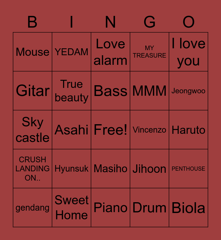 This bingo card has a free space and 24 words: Hyunsuk, Sweet Home, Bass, gendang, I love you, Mouse, Gitar, YEDAM, Vincenzo, Masiho, MMM, Sky castle, Jihoon, PENTHOUSE, True beauty, Drum, Haruto, Love alarm, Jeongwoo, Asahi, Biola, CRUSH LANDING ON.., MY TREASURE and Piano.