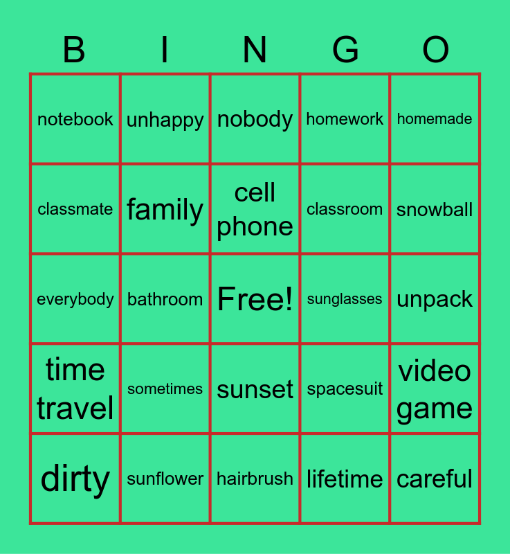 This bingo card has a free space and 44 words: dining room, careful, headphones, dirty, inside, lifetime, nobody, fearless, homemade, sunflower, homework, sunglasses, sunset, sometimes, snowman, hairbrush, harmless, everybody, reuse, snowball, unhappy, popcorn, rewrite, notebook, unkind, unpack, spaceman, spaceship, spacesuit, time travel, toothbrush, video game, airport, basketball, bathroom, bedroom, birthday, butterfly, cell phone, classmate, classroom, neighbor, family and morning.