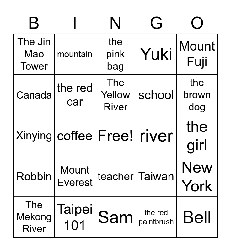 This bingo card has a free space and 24 words: Mount Everest, Taipei 101, The Yellow River, The Mekong River, Mount Fuji, The Jin Mao Tower, Canada, mountain, river, teacher, school, Xinying, Taiwan, New York, the red car, the red paintbrush, the girl, the pink bag, the brown dog, coffee, Bell, Robbin, Yuki and Sam.