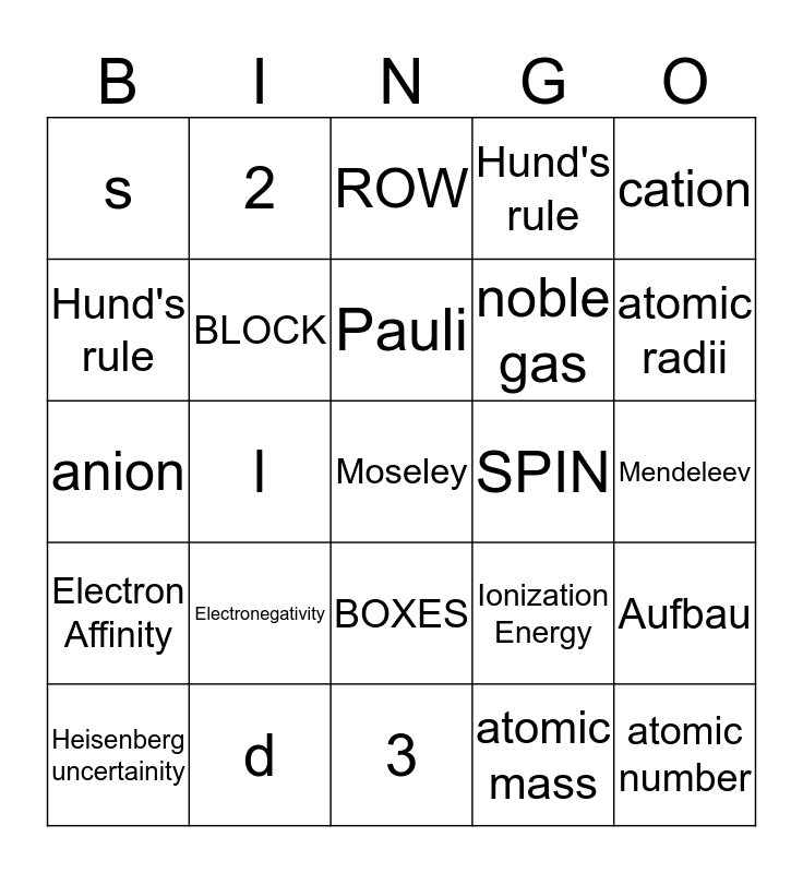 This bingo card has 30 words: d, n, l, m, s, ROW, BLOCK, BOXES, SPIN, 3, Mendeleev, Moseley, atomic mass, atomic number, atomic radii, Ionic radii, Ionization Energy, Electron Affinity, Electronegativity, cation, anion, 8, 2, noble gas, Hund's rule, Hund's rule, Aufbau, Heisenberg uncertainity, Pauli and 32.