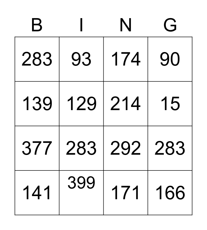 This bingo card has 16 words: 399, 283, 174, 283, 377, 93, 292, 171, 139, 129, 141, 90, 283, 15, 214 and 166.