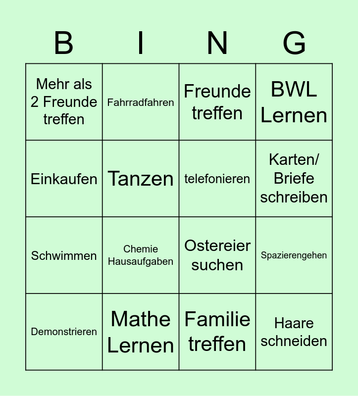 This bingo card has 16 words: Mathe Lernen, Spazierengehen, Freunde treffen, Mehr als 2 Freunde treffen, Schwimmen, Fahrradfahren, Ostereier suchen, Familie treffen, Einkaufen, Tanzen, Demonstrieren, BWL Lernen, Chemie Hausaufgaben, Karten/ Briefe schreiben, telefonieren and Haare schneiden.