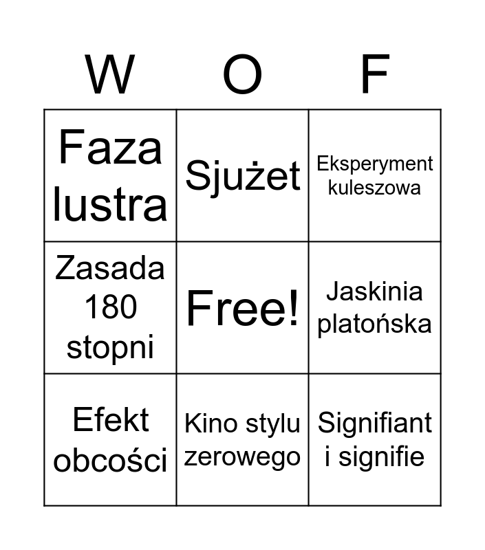 This bingo card has a free space and 8 words: Jaskinia platońska, Eksperyment kuleszowa, Sjużet, Efekt obcości, Faza lustra, Signifiant i signifie, Zasada 180 stopni and Kino stylu zerowego.