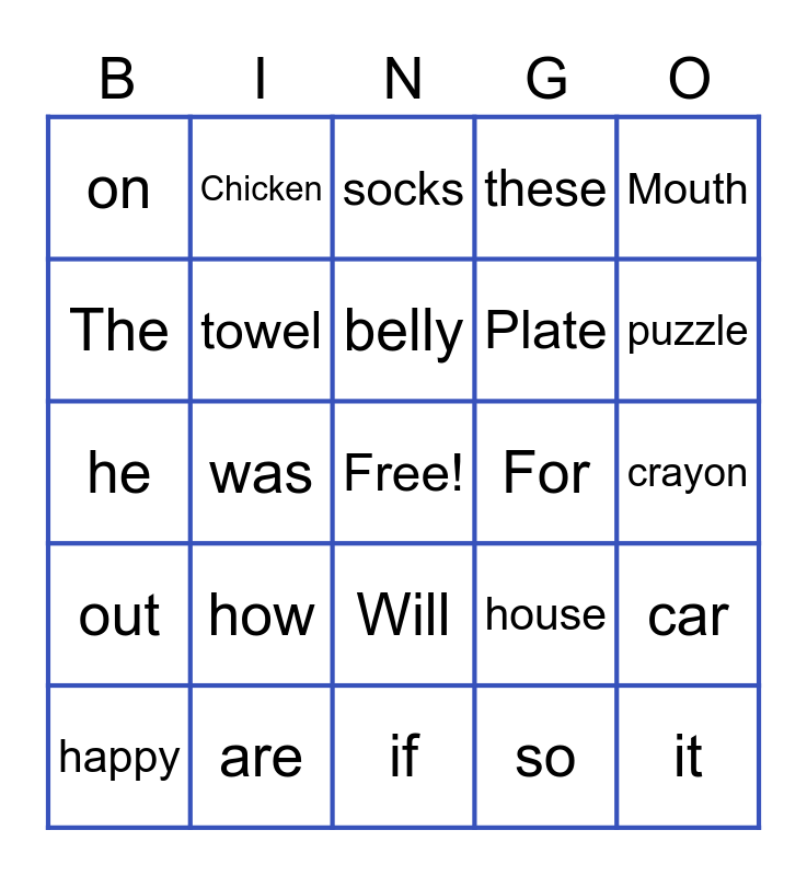 This bingo card has a free space and 24 words: how, are, belly, happy, Mouth, on, The, Chicken, For, Will, Plate, he, house, car, towel, so, crayon, socks, puzzle, was, it, out, these and if.
