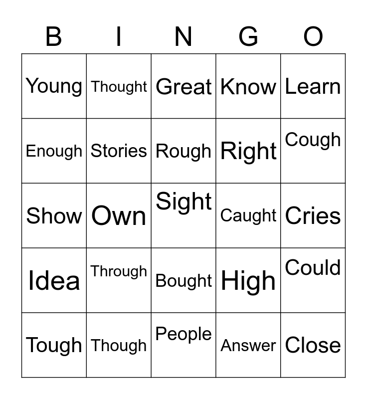 This bingo card has a free space and 24 words: Through, Though, Rough, Tough, Learn, Young, Enough, Thought, Caught, Bought, Right, Show, High, Could, Stories, Answer, Cries, Great, Cough, Own, Close, Idea, Know and People.