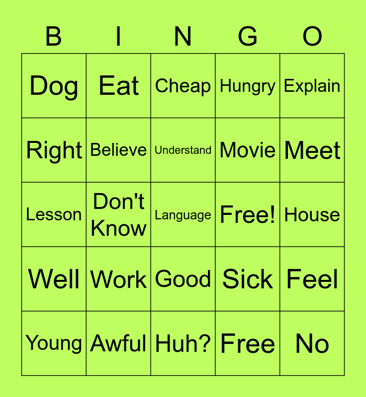 This bingo card has 30 words: Awful, Cat, Don't Know, Dirty, Dog, Cheap, Believe, Good, Free!, Huh?, House, Language, Free, No, Meet, Sorry, Sick, Well, Work, Explain, Lesson, Food, Eat, Movie, Right, Hungry, Feel, Young, Understand and Please.