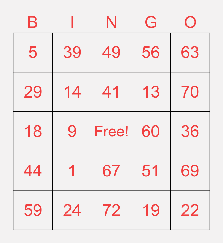 This bingo card has a free space and 24 words: 1, 24, 41, 59, 63, 5, 29, 39, 60, 67, 13, 18, 51, 69, 14, 19, 36, 49, 70, 9, 22, 44, 56 and 72.