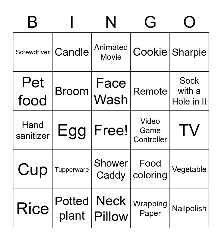 This bingo card has a free space and 24 words: Tupperware, Potted plant, Face Wash, Rice, Sharpie, Screwdriver, Pet food, Candle, Video Game Controller, Shower Caddy, Remote, Hand sanitizer, Food coloring, Vegetable, Broom, Wrapping Paper, TV, Animated Movie, Sock with a Hole in It, Egg, Nailpolish, Cup, Cookie and Neck Pillow.