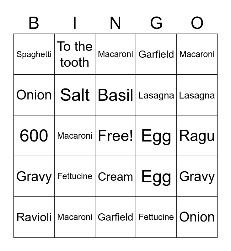 This bingo card has a free space and 58 words: Egg, Macaroni, Ravioli, Gravy, Fettucine, Ragu, Salt, Ragu, Lasagna, Semolina, Garfield, Farfalle, Basil, Cream, Celery, Spaghetti, Onion, Macaroni, 600, Basil, Egg, Macaroni, Ravioli, Gravy, Fettucine, Ragu, Salt, Ragu, Lasagna, Semolina, Garfield, Farfalle, Basil, Cream, Celery, Spaghetti, Onion, Macaroni, 600, Basil, Fettucine, Ragu, Egg, Ragu, Fork, Semolina, Alphabet, Cream, Garfield, China, Celery, Yankee Doodle, Fork, Macaroni, To the tooth, Gravy, Onion and Ravioli.