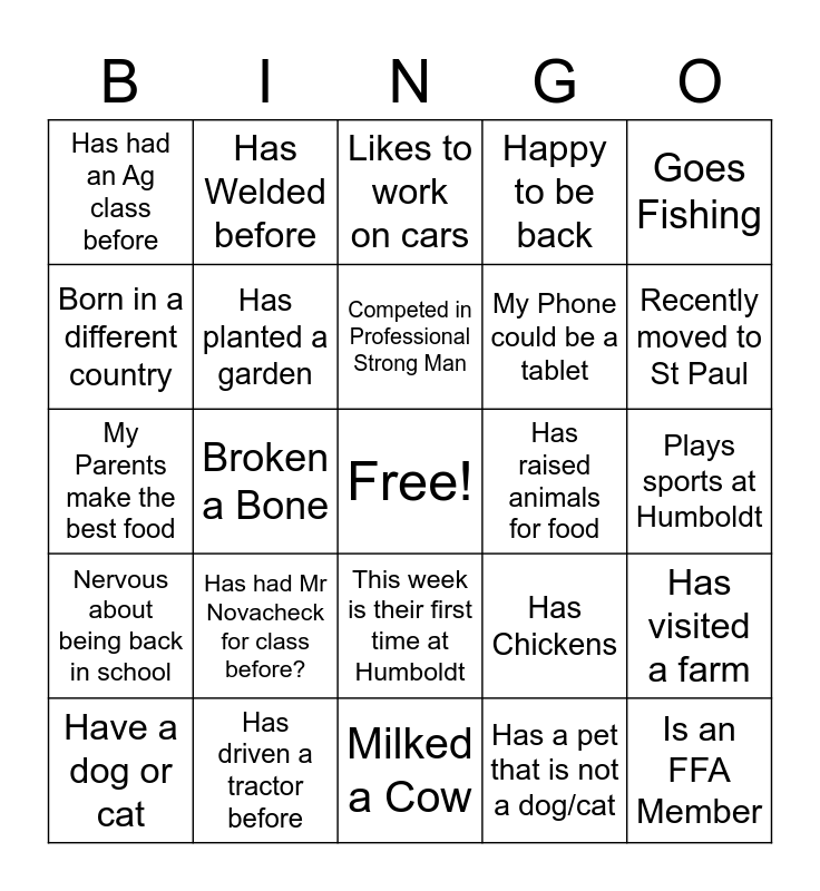 This bingo card has a free space and 24 words: Has had Mr Novacheck for class before?, Has driven a tractor before, Competed in Professional Strong Man, Have a dog or cat, Goes Fishing, Has had an Ag class before, Born in a different country, Has Welded before, Has raised animals for food, This week is their first time at Humboldt, My Phone could be a tablet, My Parents make the best food, Has Chickens, Has visited a farm, Has planted a garden, Has a pet that is not a dog/cat, Plays sports at Humboldt, Likes to work on cars, Recently moved to St Paul, Broken a Bone, Is an FFA Member, Nervous about being back in school, Happy to be back and Milked a Cow.