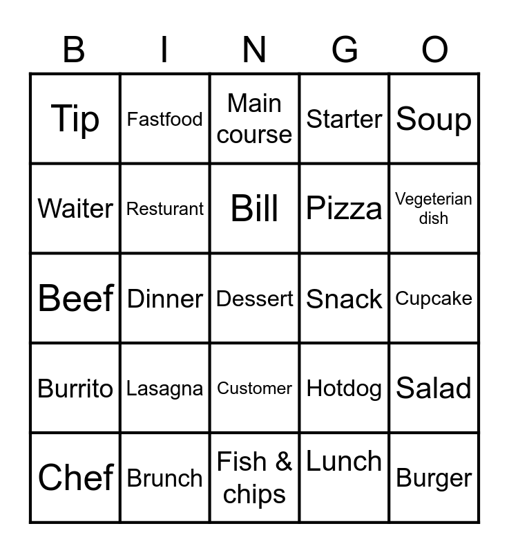 This bingo card has 25 words: Lasagna, Fish & chips, Bill, Chef, Soup, Tip, Waiter, Fastfood, Snack, Customer, Pizza, Beef, Hotdog, Salad, Resturant, Burger, Cupcake, Main course, Vegeterian dish, Dinner, Dessert, Brunch, Burrito, Starter and Lunch.