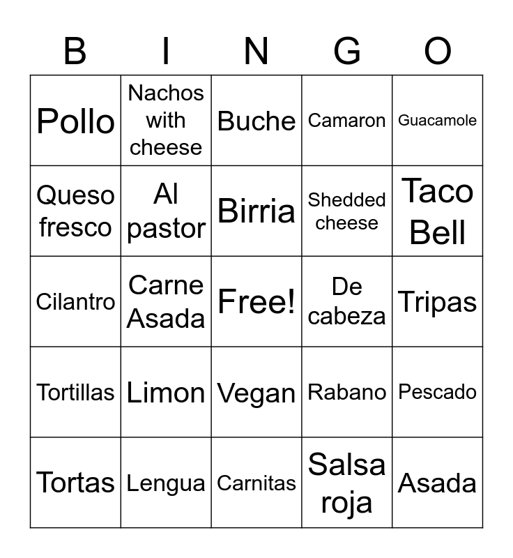 This bingo card has a free space and 29 words: Tortas, Taco, Carne Asada, Quesadilla, Pollo, Buche, Al pastor, Limon, De cabeza, Lengua, Tripas, Asada, Carnitas, Salsa roja, Taco Bell, Chile, Vegan, Tortillas, Guacamole, Cilantro, Rabano, Chapulin, Shedded cheese, Queso fresco, Camaron, Nachos with cheese, Pescado, Birria and Fajitas.