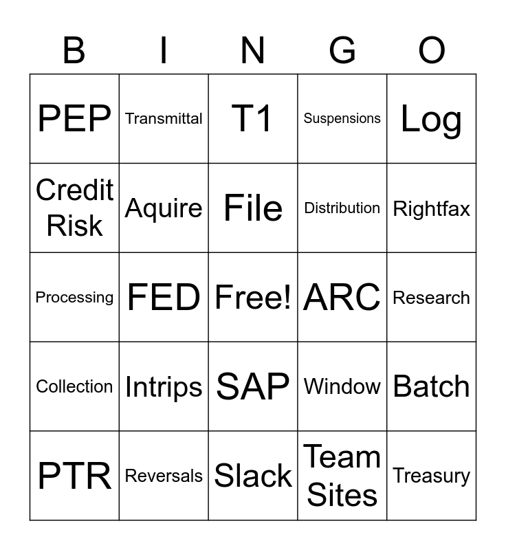 This bingo card has a free space and 29 words: PTR, Intellix, FED, EFG, PEP, T1, Aquire, Intrips, ARC, Reversals, Research, Treasury, Slack, Team Sites, Rightfax, Scoop, SAP, Collection, Log, Processing, Window, CCD, Distribution, Credit Risk, Suspensions, Transmittal, Batch, File and Prefund.