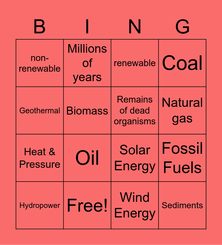 This bingo card has 16 words: Free!, Fossil Fuels, renewable, non-renewable, Heat & Pressure, Millions of years, Solar Energy, Wind Energy, Geothermal, Biomass, Hydropower, Coal, Oil, Natural gas, Remains of dead organisms and Sediments.