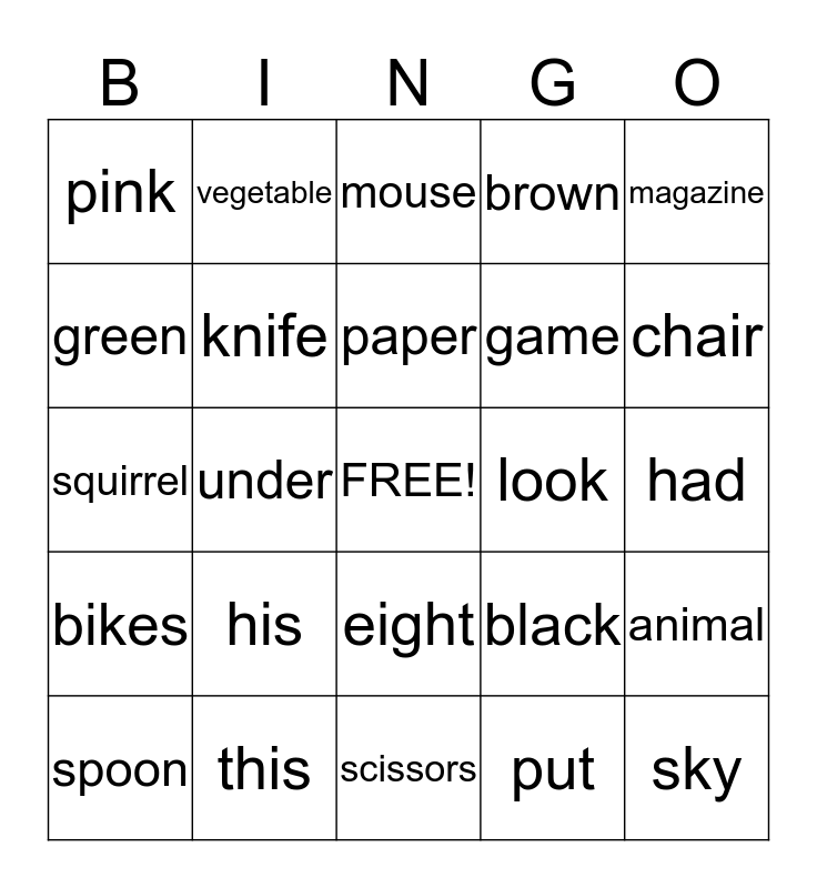 This bingo card has a free space and 24 words: his, this, paper, spoon, magazine, pink, green, vegetable, look, eight, game, squirrel, black, animal, knife, put, had, mouse, chair, under, sky, bikes, brown and scissors.