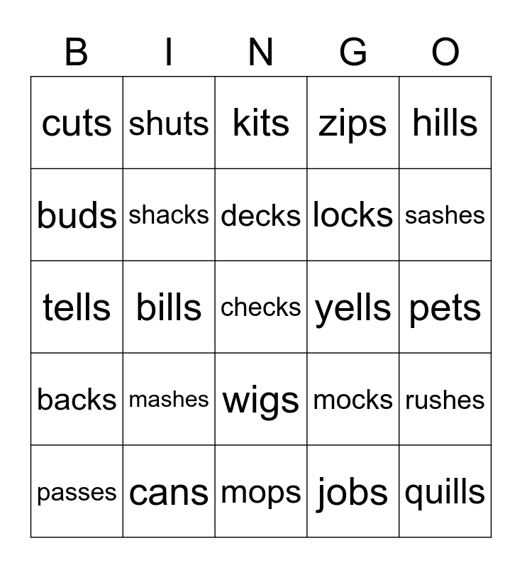 This bingo card has 25 words: backs, cans, checks, jobs, hills, cuts, shuts, kits, yells, rushes, buds, shacks, mops, mocks, sashes, passes, bills, decks, locks, pets, tells, mashes, wigs, zips and quills.