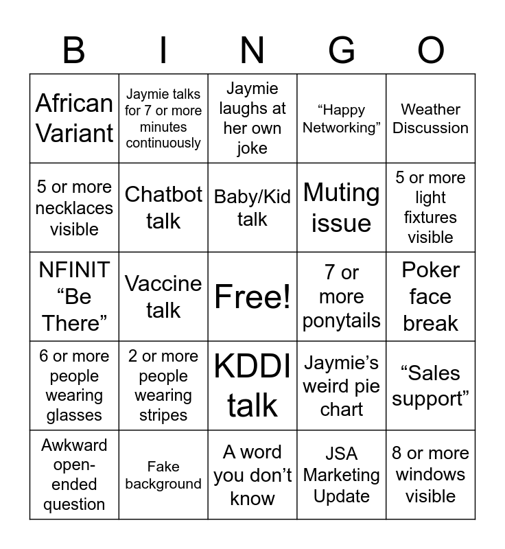 This bingo card has a free space and 24 words: 2 or more people wearing stripes, Fake background, Baby/Kid talk, Awkward open-ended question, Weather Discussion, African Variant, 5 or more necklaces visible, Jaymie talks for 7 or more minutes continuously, 7 or more ponytails, KDDI talk, Muting issue, NFINIT “Be There”, Jaymie’s weird pie chart, “Sales support”, Chatbot talk, JSA Marketing Update, Poker face break, Jaymie laughs at her own joke, 5 or more light fixtures visible, Vaccine talk, 8 or more windows visible, 6 or more people wearing glasses, “Happy Networking” and A word you don’t know.