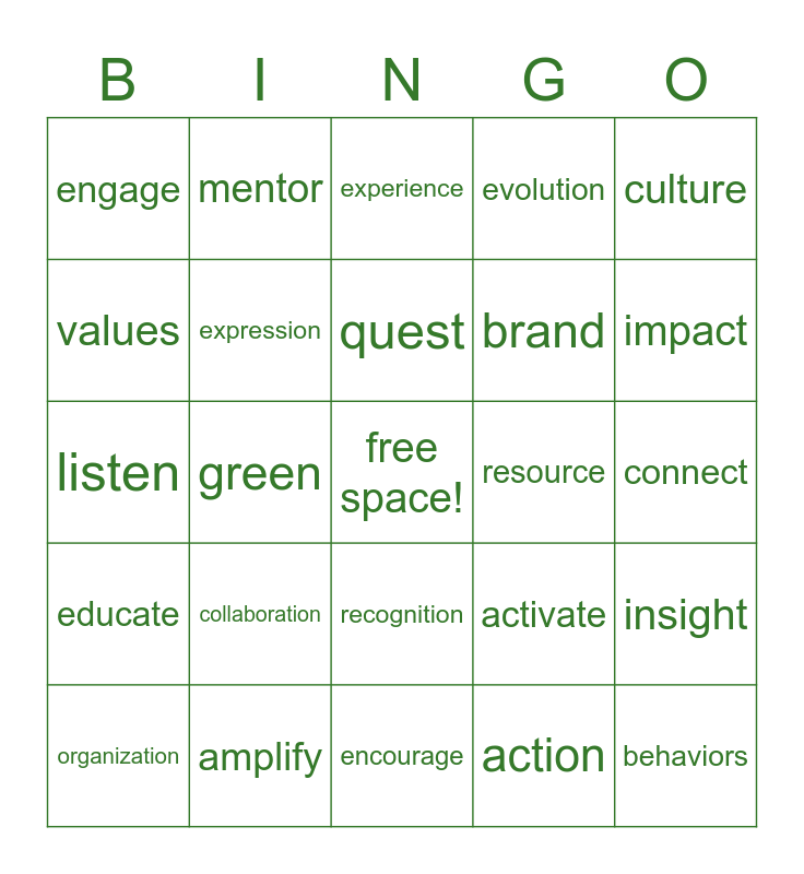 This bingo card has a free space and 28 words: insight, QVP, brand, action, values, experience, mentor, educate, resource, organization, listen, evolution, amplify, encourage, impact, celebrate, collaboration, expression, quest, recognition, engage, sharepoint, behaviors, green, connect, activate, culture and passion.