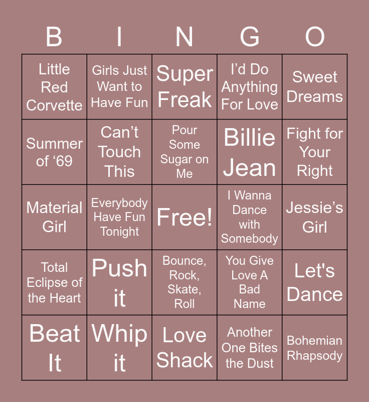 This bingo card has a free space and 25 words: Push it, Love Shack, Pour Some Sugar on Me, Beat It, Sweet Dreams, Little Red Corvette, Summer of ‘69, Girls Just Want to Have Fun, I Wanna Dance with Somebody, Bounce, Rock, Skate, Roll, Billie Jean, Material Girl, You Give Love A Bad Name, Let's Dance, Can’t Touch This, Love is A Battlefield, Jessie’s Girl, Super Freak, Fight for Your Right, Everybody Have Fun Tonight, Bohemian Rhapsody, Whip it, Total Eclipse of the Heart, I’d Do Anything For Love and Another One Bites the Dust.
