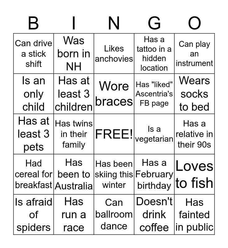This bingo card has a free space and 24 words: Has been to Australia, Has run a race, Wore braces, Is afraid of spiders, Can play an instrument, Can drive a stick shift, Is an only child, Was born in NH, Is a vegetarian, Has been skiing this winter, Has "liked" Ascentria's FB page, Has at least 3 pets, Has a February birthday, Loves to fish, Has at least 3 children, Doesn't drink coffee, Has a relative in their 90s, Likes anchovies, Wears socks to bed, Has twins in their family, Has fainted in public, Had cereal for breakfast, Has a tattoo in a hidden location and Can ballroom dance.