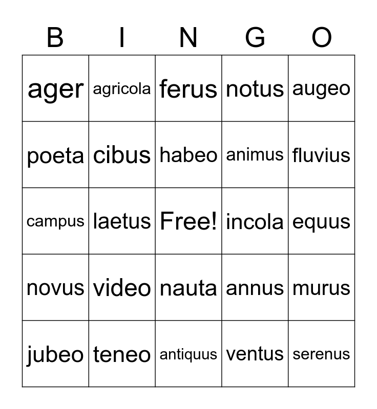 This bingo card has a free space and 24 words: video, teneo, habeo, jubeo, augeo, ager, poeta, agricola, incola, nauta, animus, campus, annus, murus, cibus, ventus, equus, ferus, fluvius, laetus, serenus, novus, notus and antiquus.