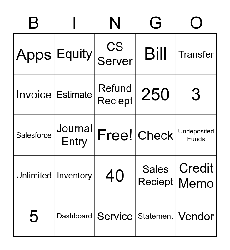 This bingo card has a free space and 47 words: Customer, Vendor, Product, Service, Inventory, Asset, Equity, Liabilities, Invoice, Expense, Estimate, Bill, Credit Memo, Sales Reciept, Profit and Loss, Balance Sheet, Refund Reciept, Check, Bank Deposit, Transfer, Journal Entry, Statement, Apps, 250, 1, 3, 5, 25, 40, Unlimited, Chart of Accounts, Rules, Project, Reconcile, Register, Dashboard, Undeposited Funds, Billable Expense, Class/Location, Purchase Order, Oii, CS Server, Salesforce, Admin Tool, Google, IBoss and Knowledge Base.