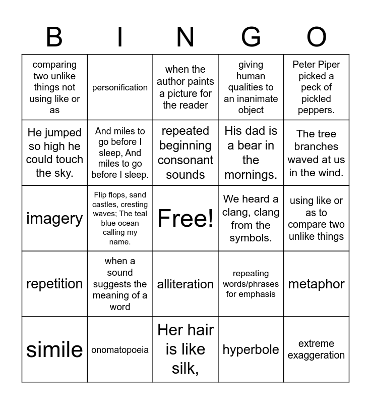 This bingo card has a free space and 24 words: simile, when a sound suggests the meaning of a word, repeated beginning consonant sounds, hyperbole, Peter Piper picked a peck of pickled peppers., comparing two unlike things not using like or as, personification, when the author paints a picture for the reader, We heard a clang, clang from the symbols., using like or as to compare two unlike things, imagery, And miles to go before I sleep, And miles to go before I sleep., repeating words/phrases for emphasis, metaphor, He jumped so high he could touch the sky., onomatopoeia, Her hair is like silk,, giving human qualities to an inanimate object, The tree branches waved at us in the wind., repetition, Flip flops, sand castles, cresting waves; The teal blue ocean calling my name., alliteration, His dad is a bear in the mornings. and extreme exaggeration.